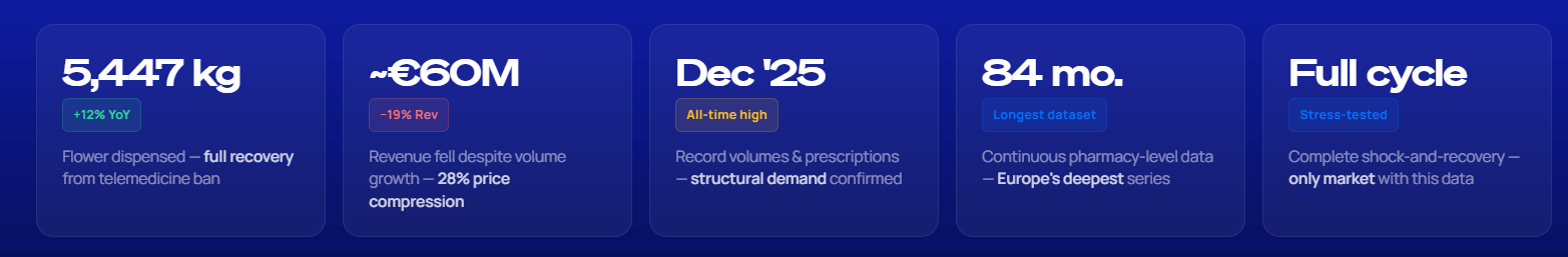 Polish pharmacies dispensed 5,447 kilograms of dried Cannabis flower in 2025, an increase of 12% from roughly 4,855 kilograms the year before. Monthly volumes recovered steadily after an initial decline, exceeding earlier peaks by October and setting a new high in December.