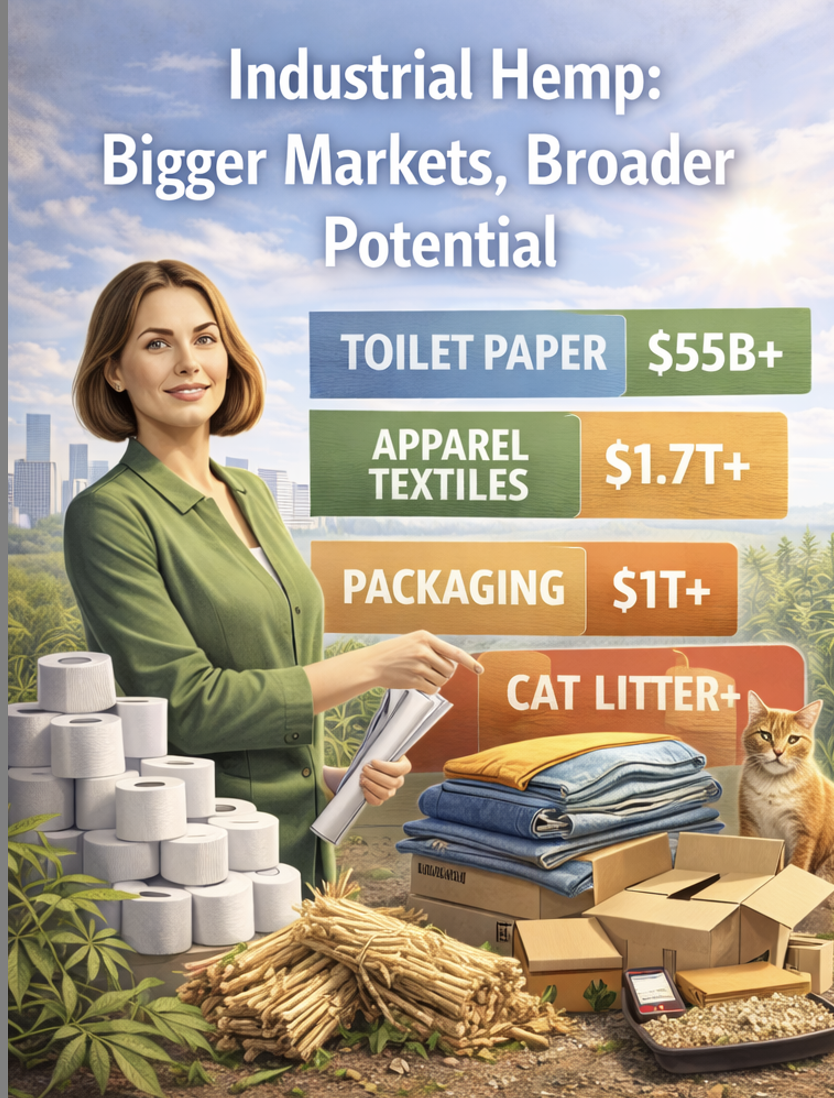 The key point across all of these: nobody is talking about banning toilet paper, t-shirts, kitty litter, or horse bedding. These categories are not politically fragile. They are not dependent on a single regulatory interpretation. They are simply markets with huge, stable demand that can be upgraded by changing only the input.